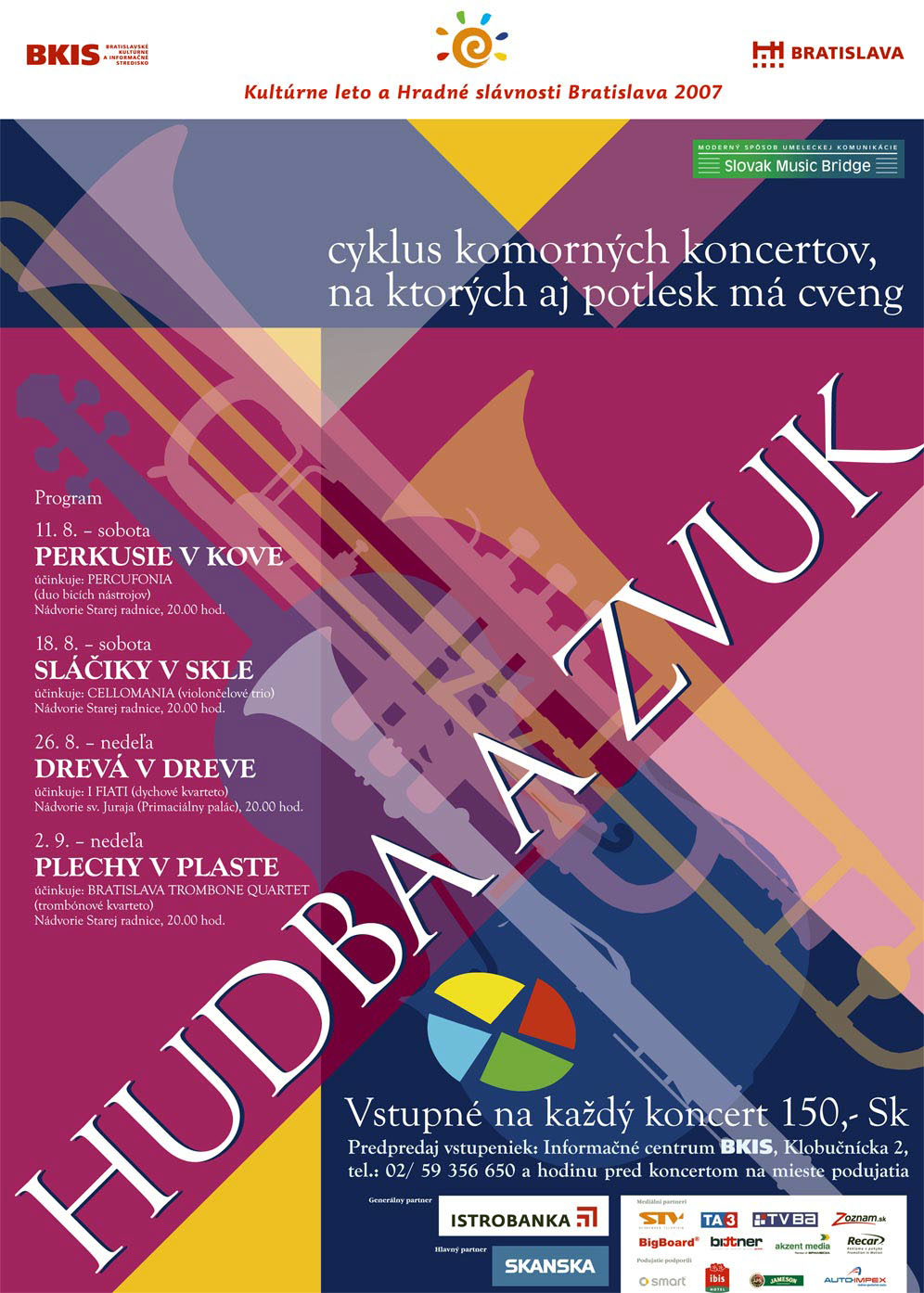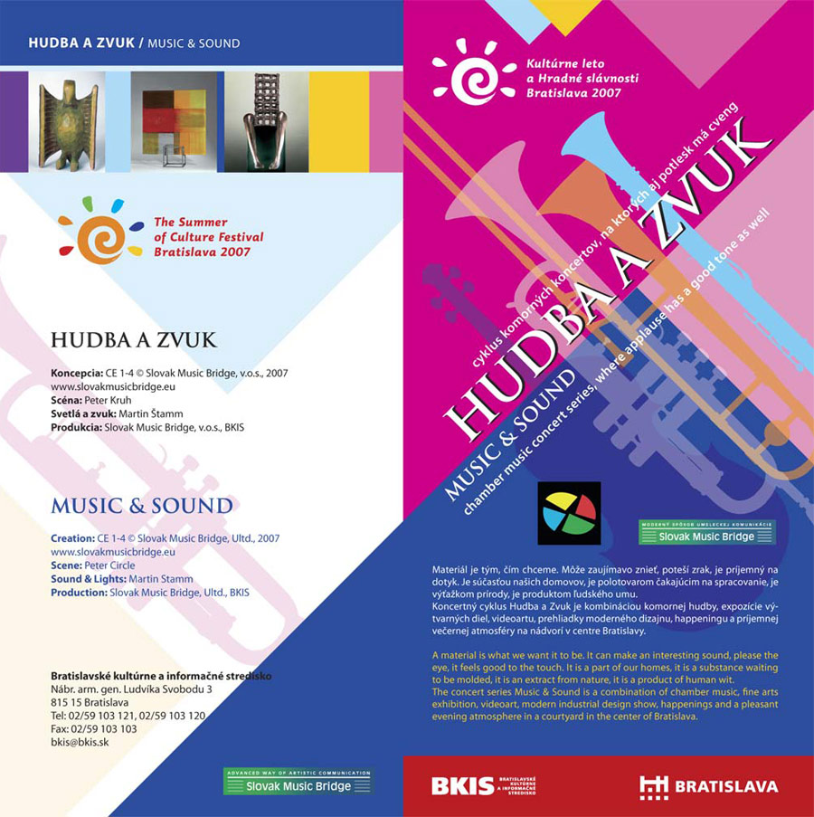 Materiál je tým, čím chceme. Môže zaujímavo znieť, poteší zrak, je príjemný na dotyk. Je súčasťou našich domovov, je polotovarom čakajúcim na spracovanie, je výťažkom prírody, je produktom ľudského umu. Koncertný cyklus Hudba a Zvuk je kombináciou komornej hudby, expozície výtvarných diel, videoartu, prehliadky moderného dizajnu, happeningu a príjemnej večernej atmosféry na nádvorí v centre Bratislavy.