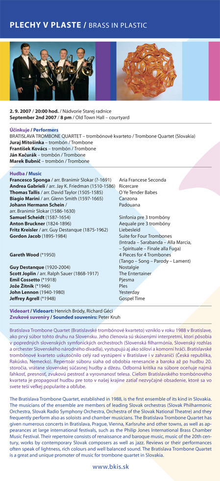 2.9. - nedeľa, 20:00 hod., Nádvorie Starej radnice, vstupné 150,- Sk Účinkuje: Bratislava Trombone Quartet – trombónové kvarteto (Slovensko) Hudba: F. Sponga / B. Slokar, A. Gabrieli / J. K. Friedman, Th. Tallis / D. Taylor, B. Marini / G. Smith, J. H. Schein / B. Slokar, S. Scheidt, A. Bruckner, F. Kreisler / G. Destanque, G. Jacob, G. Wood, G. Destanque, S. Joplin / R. Sauer, E. Cossetto, J. Žitnik, J. Lennon, J. Agrell Videoart: Henrich Bródy / Richard Géci, Zvukové suveníry: Peter Kruh |