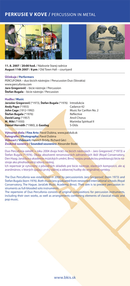 11.8. - sobota, 20:00 hod., Nádvorie Starej radnice, vstupné 150,- Sk Účinkuje: Percufonia – duo bicích nástrojov (Slovensko) Hudba: J. Gregorovič, Š. Bugala, A. Pape, J. Cage, D. Lang, M. Miki, D. Horvath, J. Gazdag Výtvarné diela: Pavol Dubina, Fotografie: Pavol Dubina, Videoart: Henrich Bródy / Richard Géci, Zvukové suveníry: Alexander Bodó