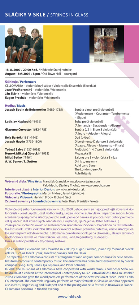 SLÁČIKY V SKLE 18.8. - sobota, 20:00 hod., Nádvorie Starej radnice, vstupné 150,- Sk Účinkuje: Cellomania – violončelový súbor (Slovensko) Hudba: J. Bodin de Boismortier, L. Kupkovič, G. Cervetto, B. Bartók, J. Haydn, T. Salva, H. Górecki, M. Betko, A. W. Benoy / L. Sutton Výtvarné diela: František Csandal, Palo Macho, Interiérový dizajn: Luxart, Fotografie: Martin Fridner, Jana Hojstričová, Videoart: Henrich Bródy / Richard Géci, Zvukové suveníry: Peter Kruh / Branislav Fekete