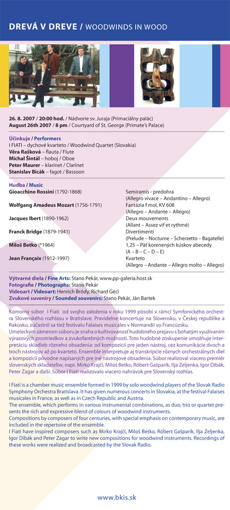 DREVÁ V DREVE 26.8. - nedeľa, 20:00 hod., Nádvorie sv. Juraja (Primaciálny palác), vstupné 150,- Sk Účinkuje: I Fiati – dychové kvarteto (Slovensko) Hudba: G. Rossini, W. A. Mozart, J. Ibert, F. Bridge, M. Betko, J. Françaix Výtvarné diela: Stano Pekár, Fotografie: Stano Pekár, Videoart: Henrich Bródy / Richard Géci, Zvukové suveníry: Stano Pekár / Ján Bartek